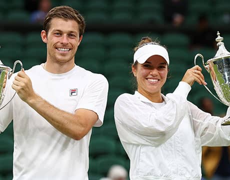 テニスのウィンブルドン(イギリス/ロンドン、芝、グランドスラム)は11日、混合ダブルス決勝が行われ、第7シードのN・スクプスキ(イギリス)/ D・クラウチェク(アメリカ)組がJ・ソールズベリー(イギリス)/ H・ダート(イギリス)組を6-2, 7-6 (7-1)のストレートで破り、ペアとして大会初優勝を飾った。