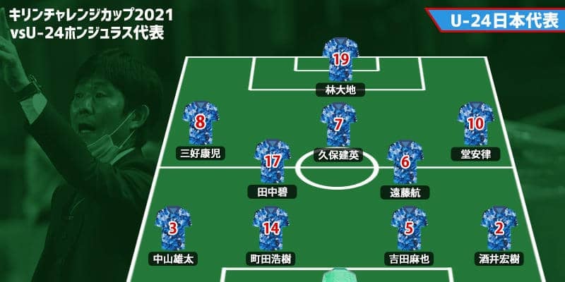 スターティングメンバーは、オーバーエイジ枠の3名に加え、MF久保建英(レアル・マドリー)やMF堂安律(PSV)、MF田中碧(デュッセルドルフ)ら主軸とみられる選手が先発。1トップにはバックアップメンバーから本登録となったFW林大地(サガン鳥栖)が起用された。