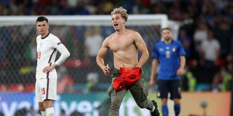Shirtless pitch invader stops England's Euro 2020 final against Italy pic.twitter.com/ZBFtHES0eW
