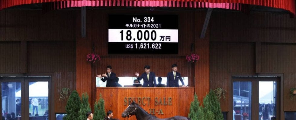 13日、北海道苫小牧にあるノーザンホースパークで、日本最大のサラブレッド市場「セレクトセール2021」2日目が開催。当歳馬セールにて上場番号334番・モルガナイトの2021(牡)が1億8000万円で落札された。