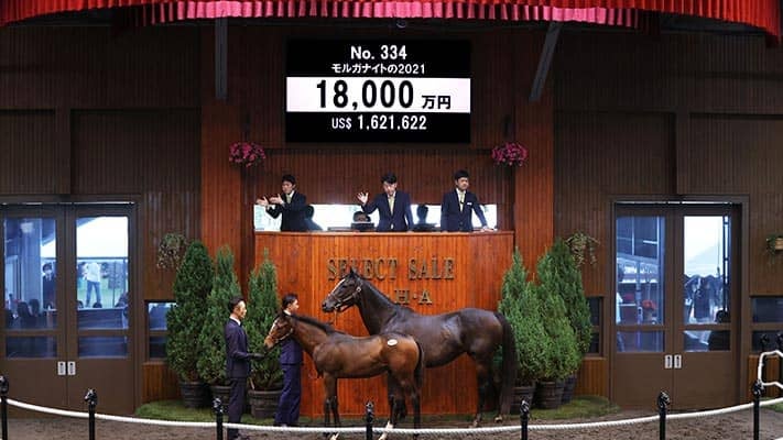 13日、苫小牧・ノーザンホースパークで行われている日本最大のサラブレッド市場「セレクトセール2021」当歳馬セールにて、上場番号334番・モルガナイトの2021(牡)が1億8000万円で落札された。