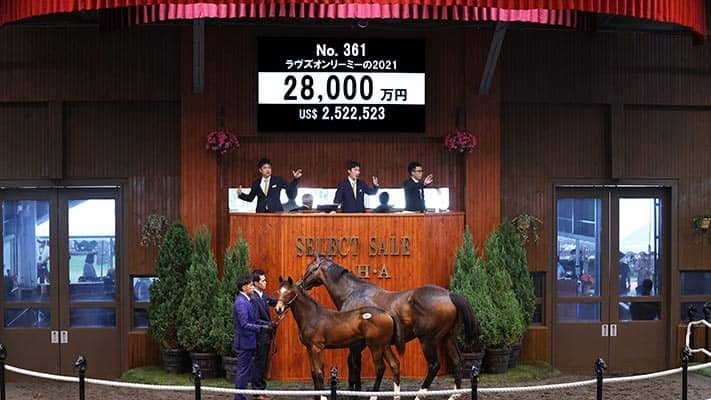 13日、苫小牧・ノーザンホースパークで行われている日本最大のサラブレッド市場「セレクトセール2021」当歳馬セールにて、上場番号361番・ラヴズオンリーミーの2021(牡)が2億8000万円で落札された。