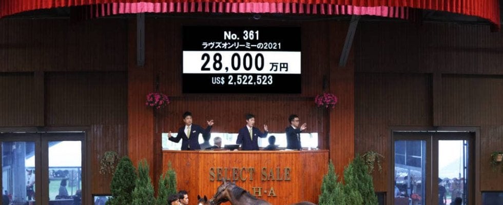 13日、北海道苫小牧にあるノーザンホースパークで、日本最大のサラブレッド市場「セレクトセール2021」2日目が開催。当歳馬セールにて上場番号361番・ラヴズオンリーミーの2021(牡)が2億8000万円で落札された。