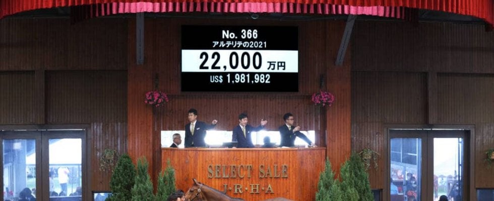 13日、北海道苫小牧にあるノーザンホースパークで、日本最大のサラブレッド市場「セレクトセール2021」2日目が開催。当歳馬セールにて上場番号366番・アルテリテの2021(牡)が2億2000万円で落札された。