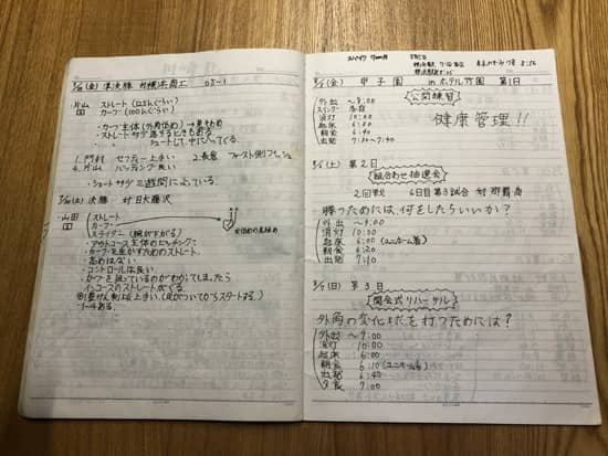 山本 体力面を鍛える練習もそうですが、細かいプレーの座学も、夜に寮などでとことんやりましたね。(インタビューに持参した当時のノートをめくりながら)たくさんメモしていますけど、対戦校の投手や打者の特徴、戦術など、"野球学"を徹底的に叩き込まれました。「お前はバカで書かないと忘れるから、とにかく書け!」と言われたりして(笑)。