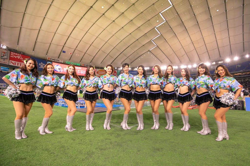 初めて決勝チームとして東京ドームに立った時のオープニングパフォーマンスの写真です。アロハシャツを着て、夏をイメージしたスペシャルパフォーマンスを披露しました。Rookie yearで決勝チームとしてサイドラインに立てたことはやはり印象的で、今でも忘れられません