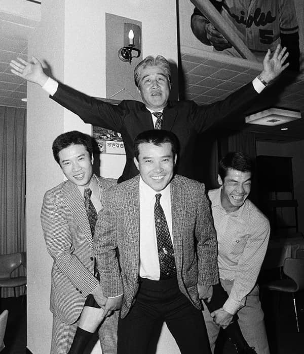 1973年の後期優勝を決め、西本幸雄監督を担ぐ長池(中央)、山田久志(左)、福本豊(右)の各選手(写真=共同通信)