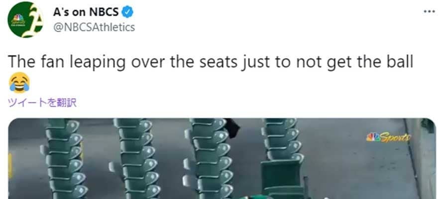 客席を転がるファウルボールを追いかけた青年の悲しき“末路”が反響を呼んでいる(画像は米スポーツ専門局「NBCスポーツ」アスレチックス専門ツイッターより)