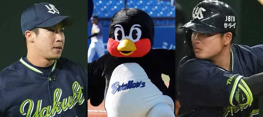 ヤクルト・山田哲人、つば九郎、村上宗隆(左から)【写真:荒川祐史】