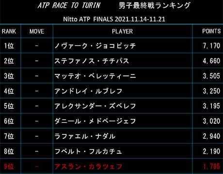 男子テニス最終戦のNitto ATPファイナルズ(イタリア/トリノ、室内ハード)出場をかけた「RACE TO TURIN」(最終戦出場ランキング)が19日に更新され、上位陣に大きな変動はなかった。