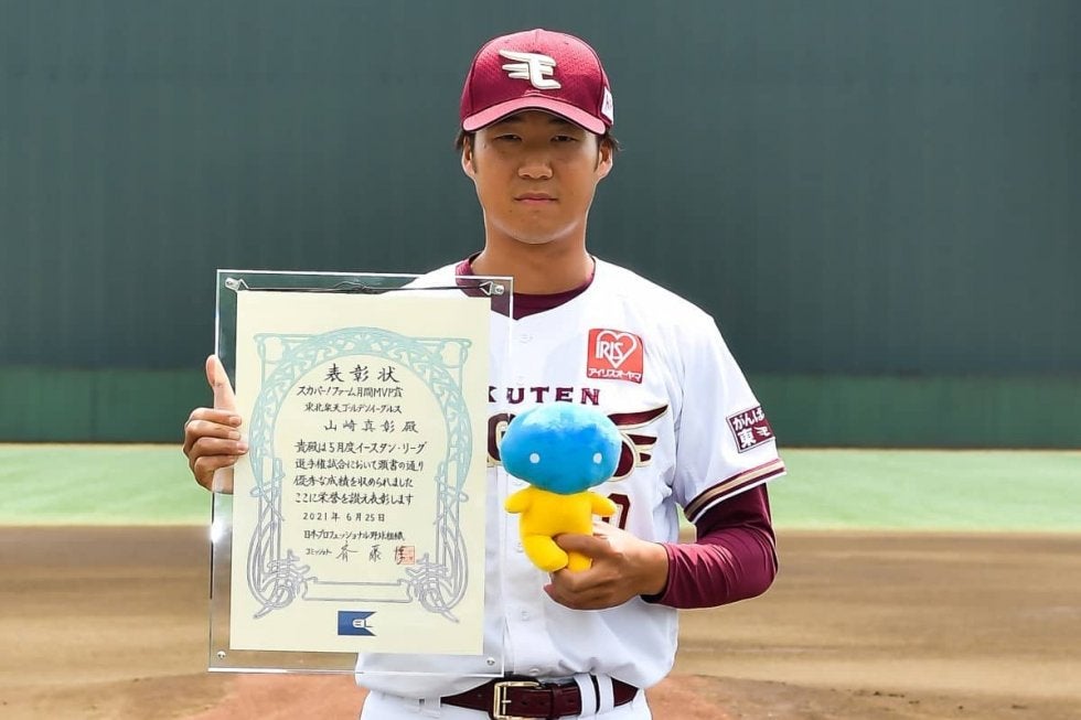 東北楽天ゴールデンイーグルス・山崎真彰選手(※「崎」は正しくは「立さき」)が5月度「スカパー!ファーム月間MVP賞」を受賞した。この賞は、その月のファーム公式戦を通して成績優秀な若手で飛躍が期待される選手を称えたもの。