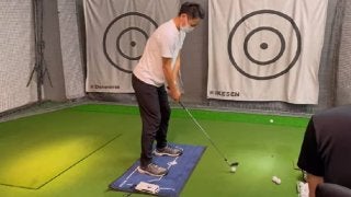 バックスイングの時点では右に9割ほど乗る結果となっています。先ほど菅原トレーナーはその場でスイングしているイメージと言っていましたが、実際はかなり右に乗っていました。ドライバーショットでは、このくらい右に乗ることはありますが、アイアンで右に乗りすぎてしまうと、スウエイをしてしまう可能性と、左にカラダを戻す動作が生まれるため、タイミングが合わなくなる可能性が出てきます。