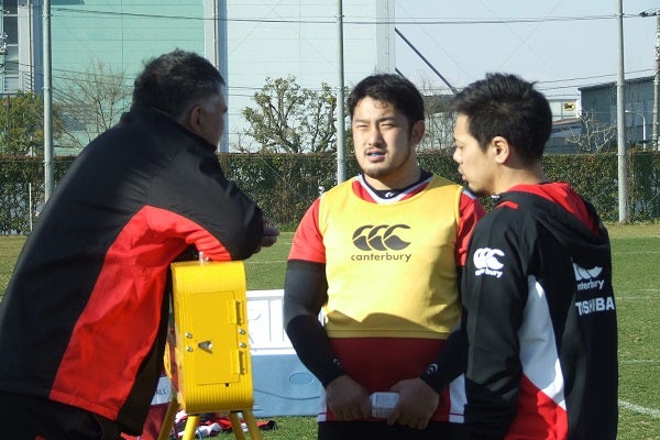 9日午後のトレーニング終了後、PR渡邉隆之(東海大4年、4月から神戸製鋼コベルコスティーラーズ)を呼び止め、約10分間、話し合った。