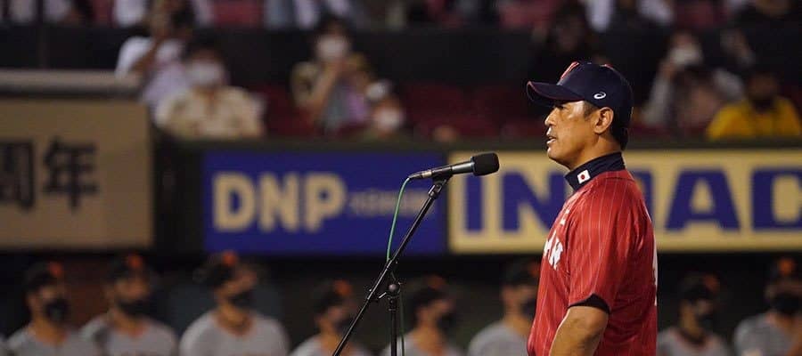 稲葉篤紀監督は試合終了後の壮行セレモニーで、スタンドに足を運んだファンに「無観客試合ではありますが、皆さんがテレビの前で応援してくれている、その思いを胸に、皆さんと一緒に金メダルを取りたいと思います」と語りかけ、万雷の拍手を浴びた。(宮脇広久 / Hirohisa Miyawaki)