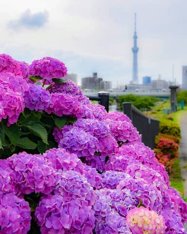 東京の平井駅から少し歩いたところにある、ふれあい橋から撮った紫陽花とスカイツリーです。ここはかなり有名な撮影スポットで、私が撮った日も、たくさんの人たちが写真を撮っていました。この橋は夜になるとライトアップされるので、スカイツリーと絡めて撮ると、また綺麗な写真が撮ることができるので、是非また行きたいスポットです!