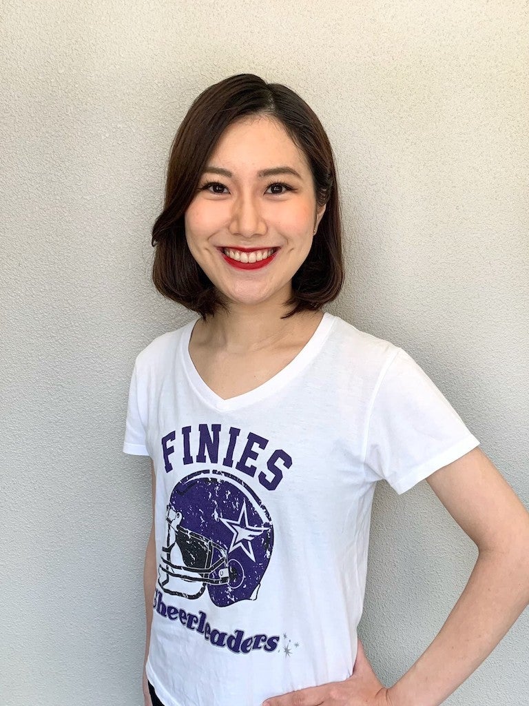 この写真は、SNSでのルーキーお披露目の為、川中尚子ディレクターやベテランズにメイクや髪型、写り方のアドバイスをいただき、初めてファイニーズのTシャツを着て撮影したものです。ファイニーズチアの一員になれたんだと改めて実感し、嬉しかったことを覚えています!