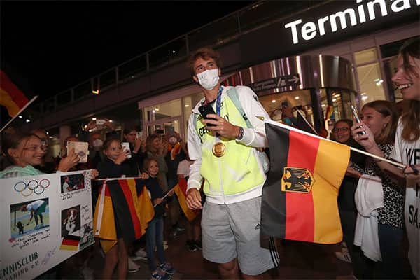 東京オリンピック(日本/東京、ハード)で優勝を果たした世界ランク5位のA・ズベレフ(ドイツ)は2日、多くのファンが待つ空港に金メダルと共に凱旋した。同日には自身のSNSを通じて「金メダルがドイツに上陸した」とつづった。