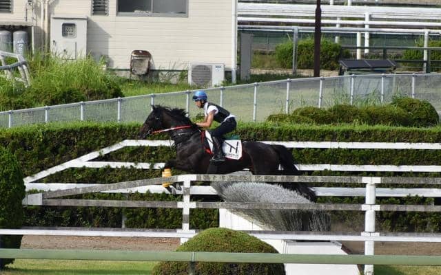 今朝11日も平沢健治騎手を背に、障害コースで飛越練習。無駄な滞空時間のない飛びなのに、安定感のある飛越を見せていた。