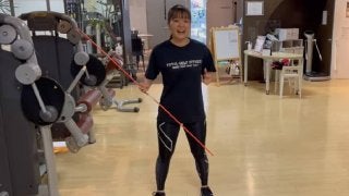 ①片膝立ちになり、バー持ち手を上げます
