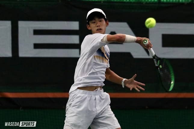 白石光(スポ3=千葉・秀明大秀明八千代)はこの試合でもさすがの実力を披露。ラリーの早い段階で前に行くなど、積極的に攻めるようにしてあっという間にポイントを奪っていく。攻めにいってのミスからゲームを取られることもあったが相手に与えたゲームはわずか3つ。1時間もかからない試合時間で高速で決着をつけた。丹下将太(教3=東京・早実)は決め球のショットをミスするなど、100パーセントの力を出せたわけではなかった。それでも、第8ゲームから3ゲーム連取し、逆転で第1セットを獲得すると第2セットも優位に立ち、6-4で勝利した。高畑里玖(社2=兵庫・相生学院)は第1セットの第1ゲームからいきなりブレークし、幸先よく試合に入る。しかし、第6ゲームでブレイクバックを許すとそのままサービスキープの展開となり、タイブレークへ。こちらは序盤からポイントを奪われ、第1セットを獲得することはできなかった。第2セットは相手のミスが続くようになり、4ゲームを連取する。しかし、「集中力もプレーもあまり嚙み合わずになあなあで進んでしまっていた」(高畑)と振り返るように、そこから4ゲームを失い追いつかれる。その後の2ゲームを連取し、試合は10ポイントタイブレークへ。序盤は高畑の流れで進み、一時は6-2と引き離すも、ゆっくりとしたテンポのラリーが続く中で攻めきることができず、7-7と追いつかれる。その後、高畑が2回マッチポイントを握るも、あと1ポイントが遠かった。決めきることができず、10-12で接戦に敗れ、悔しさをにじませた。