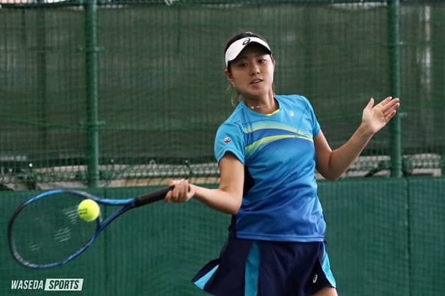 早くも2回戦から実現した押川千夏(社3=福井・仁愛女子)と吉岡希紗(スポ3=三重・四日市商)の同校対決は序盤から緊迫した展開に。速いテンポのラリーが続き、互いにゲームを取り合う。一時は5-3と吉岡がリードしたが、第9ゲームから押川の厳しいところを狙った速いストロークが決まるようになり、押川が4ゲームを連取して逆転で第1セットを獲得する。第2セットでは吉岡も自分から攻めに行く展開をつくろうとするも、第3ゲームの後にメディカルタイムアウトを取ったように、足の調子が悪くなかなか反撃できない。「流れもつかめないしリズムも乗っていけなかった」(吉岡)というように、押川が攻める展開は変わらず。第2セットは6-3で押川が同士討ちを制した。安藤優希(スポ1=東京・日出)は安定した試合運びを披露。長いラリーが続く中で、打ちにいくところとつなぐところのメリハリをつけ、あまりミスをすることなくポイントを重ねていく。第1セットはわずか1ゲームしか与えずに試合は第2セットへ。フォア、バックともに低く鋭い相手のストロークが入るようになり、第1セットのように簡単にはいかなかったが、粘り強くラリーし、試合の流れは渡さない。5-5から最後は2ゲーム連取で相手を下した。渡邉優夢(社1=兵庫・相生学院)は、昨年のインカレにおいて単複2冠を達成した阿部宏美(筑波大)と対戦した。序盤から強打に苦しめられる場面が散見されるも、負けじと渡邉もサーブから流れを引き寄せる場面を演出。粘り強さを遺憾(いかん)なく発揮する。結果としては敗戦を喫したが、前年度女王から第1セット、第2セット共に2ゲームずつを奪うなど、1年生ながら実力の高さをみせた。