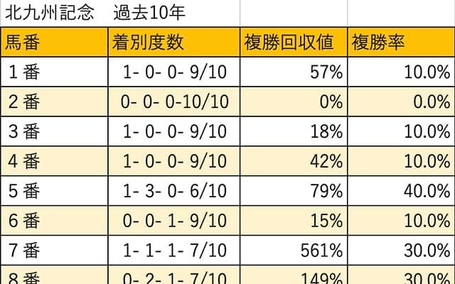 22日に小倉競馬場で行われる北九州記念(3歳上・GIII・芝1200m)について枠順・馬番別に検証していく。 過去1…