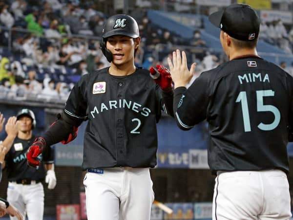8月14日のオリックス戦で勝ち越し打を放ち、美馬(右)に迎えられるロッテ・藤原