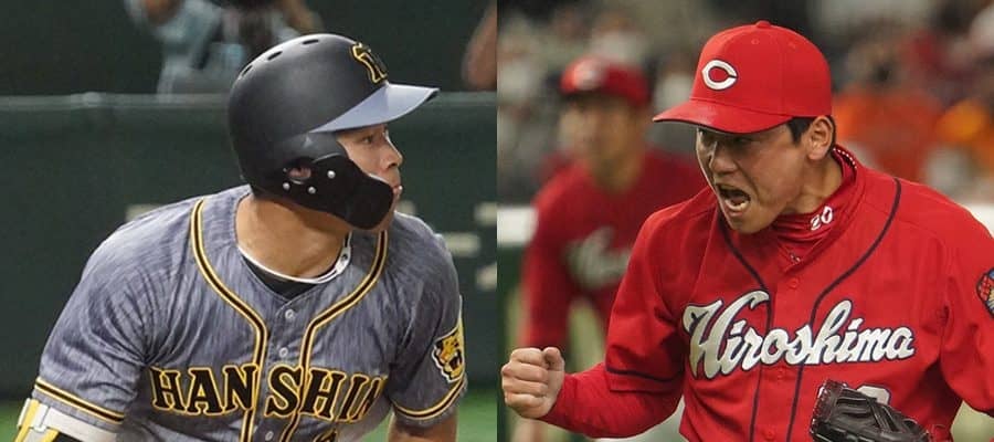 阪神・佐藤輝明(左)と広島・栗林良吏【写真:荒川祐史】