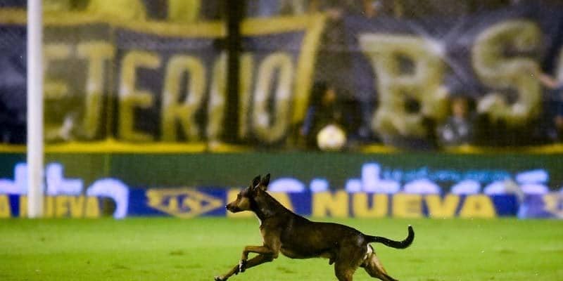 シュートはゴールライン上で犬のお尻にヒット。驚いてそのままピッチの外へと飛び出していった。