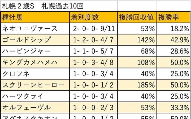 4日に札幌競馬場で行われる札幌2歳S(2歳・GIII・芝1800m)について血統・種牡馬別に検証していく。なお、函館競馬場で代替開催された2013年はデータの集計対象外とした。