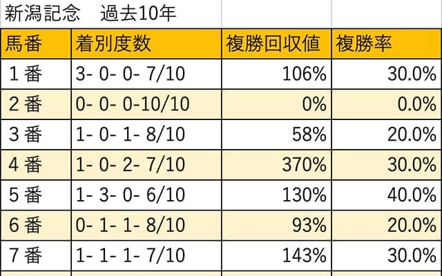 5日に新潟競馬場で行われる新潟記念(3歳上・GIII・芝2000m)について枠順・馬番別に検証していく。 過去10年…