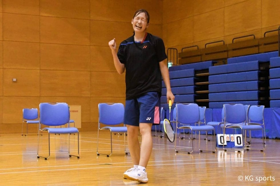 <写真・接戦を制しガッツポーズを見せた三嶋〉 9月5日、和歌山ビックホエールウェーブにて令和3年度関西学生バドミントン秋…