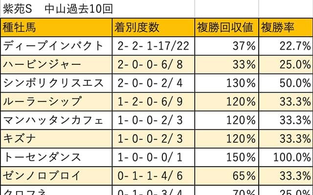 過去10年で最多となる5回の馬券絡みがディープインパクト。次点で3回のルーラーシップが続き、2回がハービンジャー、シンボリクリスエス、ゼンノロブロイとなっている。