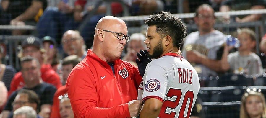 ナショナルズのルイーズが153キロの直球をヘルメット越しに右頬に受け負傷交代