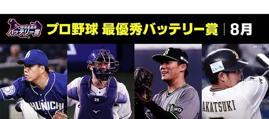 中日の柳は8月20日の阪神戦で完封勝利を挙げるなど期間中3試合に登板し、防御率0.43、20奪三振の好成績。木下とは3・4月度、5月度に続き、3度目の受賞となった。柳は「選出していただいて大変嬉しく思います。ありがとうございます。来月も選んでいただけるような活躍ができるよう、バッテリーで頑張りたいと思います」とコメント。木下は「この度は、このような賞をいただき光栄に思います。シーズン残り試合少なくなってきましたが、1つでもチームの勝利に貢献できるように、2人で力を合わせてやっていきます」と受賞を喜んだ。
