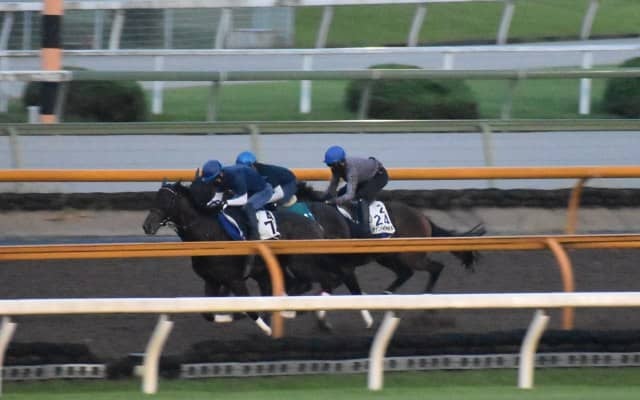 今朝15日はレースに向けた追い切り。朝一番のCWコースで岩田望来騎手が跨っての3頭併せ。先頭がカントル、それにチェルノボーグが続き、一番後ろから追いかける隊列となった。