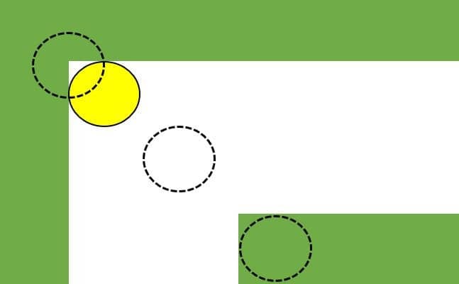 これには実は混乱があったらしい。正しくは、図の黄色い丸印のところ、すなわち白いラインの外側に接するように置く。白いラインは「ピッチ内」である。フラッグポストも、その全体がピッチ内になければならない。破線で示した右下の2カ所、フラッグポストの外になお「ピッチ」があるのは明らかな間違いだが、日本では、2002年までは、ピッチの角にフラッグポストの中心を置く、もうひとつの破線の位置に設置されていたという。
