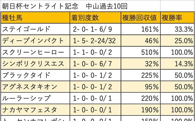 過去10年で最多となる8回の馬券絡みがディープインパクト。次点で3回のステイゴールドが続き、2回がスクリーンヒーロー、キングカメハメハ、ハーツクライとなっている。