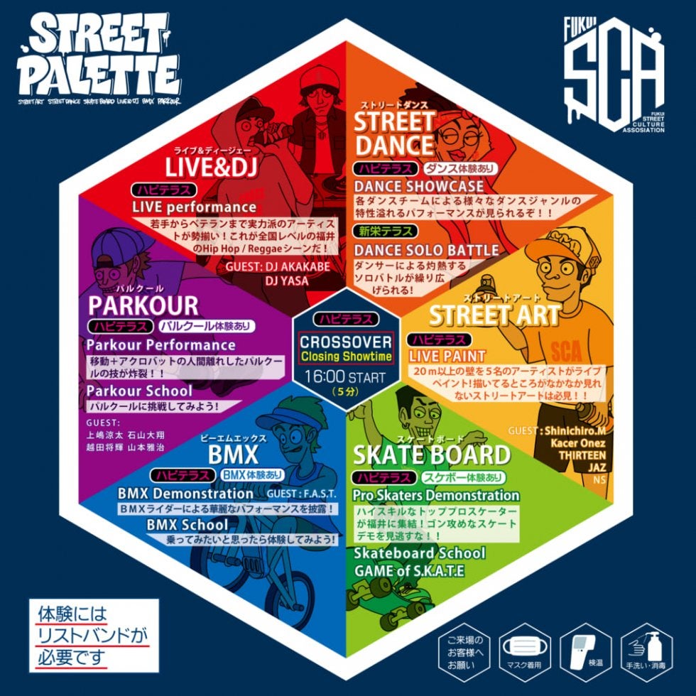 今回、初となるイベント「ストリートパレット2021」では、ダンス、スケートボード、ライブ&DJ、ストリートアート、BMX、パルクールの6つを実施。ストリートカルチャー人口を増やしたいという思いで、福井県とも連携を行い、スケートボード、ダンス、BMXでは、興味のある子供向けの体験会も実施するなど、ビギナーから楽しめるイベントを目指す。