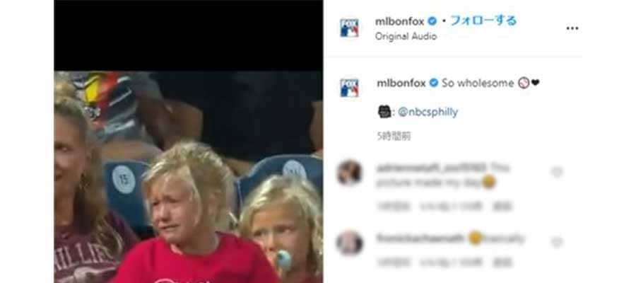 同アカウントでは「とっても心温まる」との文面で実際の動画を公開。米ファンは「これ見たおかげで良い日になった」「フィリーズのファン……最高だ!」「いいね」「グッジョブ」「よくやったぞ」「野球最高だ」「彼にもボールあげるべきだね」「クールだ」などと感動が広がっている。