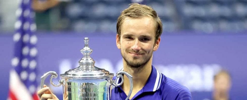 「全米オープン」の優勝トロフィーを抱えるメドベージェフ