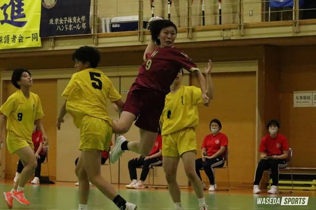 試合開始早々から猛攻を見せる東女体大に対し、ここまでの3試合では機能していたセットDFが崩され、連続失点を喫する。PV紅林詩乃主将(スポ4=東京・佼成学園女)のポストプレーで東女体大の選手が退場し、ペナルティスローを獲得すると、これを浦野が落ち着いて決め、チーム初得点を挙げる。しかし、その後も東女体大の素早い速攻によって点差を広げられる。桐林香奈(商4=静岡・清水東)のサイドシュートやRB阿部美幸(スポ4=東京・佼成学園女)の速攻で得点を挙げるが、相手の勢いを跳ね返すことができなかった。早大のシュートが決まらずチームとして苦しい時間帯ではGK川村夏希(スポ2=東京・佼成学園女)がファインセーブを見せ、チームを鼓舞する。点差を広げられたくない早大は阿部美のスピードに乗ったカットインから得点し応戦する。しかし、前半終了間際に連続失点を喫し6点差で前半を終えた。