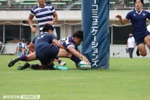 曇り空の下、明大は関東大学対抗戦(対抗戦)の第2戦、立大戦に臨んだ。明大にとって対抗戦初の有観客試合となったこの試合。昨年度73―15で下した立大に対し、明大は今年度も攻撃の手を緩めなかった。前半4分にラインアウトモールでのトライによって先制すると、その後も安定したセットプレーを起点に得点を重ねる。CTB江藤良が3トライを挙げる活躍を見せ、前半だけで計6トライ。40-7で前半を折り返した。後半に入ると、試合は強い雨の降る難しいコンディションに。ハンドリングエラーも散見されたが、堅いディフェンスで立大を封じ込めた明大。後半は相手に得点を与えず、68-7で勝利を収めた。