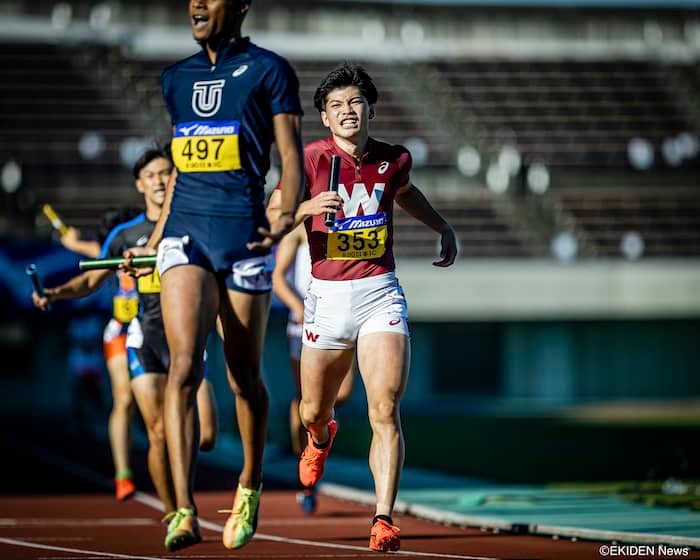 1走の小竹が上々な走り出しを見せると、先週の関東学生新人から好調が続く2走の西が第1コーナーでスピードに乗り、オープンレーンを利用して先頭に躍り出る。バトンを受け取った3走の澤は、後続に追われながらも首位をキープ。アンカーの山内へとバトンを託した。山内は先頭を譲らぬままホームストレートへ。逃げ切りたいところだったが、山内の背後で力をためていた東洋大の中島佑気ジョセフにラスト50メートルで追い抜かれ、2番手でゴール。関カレでのレース同様、東洋大に逆転負けを喫し、優勝を逃した。