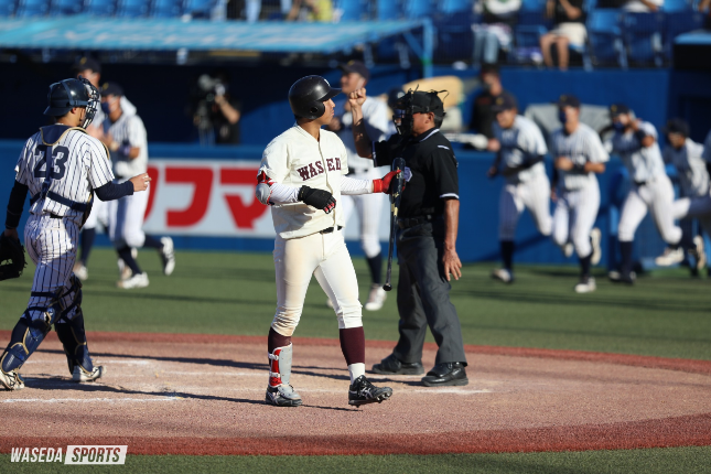 早大打線は初回、いきなり1死一、二塁の好機を演出する。しかし、相手中堅手の好捕に阻まれ、先制の機会を逃す。先発の徳山は伸びのある直球を軸に相手打線を封じにかかるが、不運な当たりもあり、2回に2点を献上。3回にも1点を追加され、序盤は立大ペースで試合が進んだ。反撃に転じたのは4回、5の遊ゴロの間に1点、5回には5に適時打が飛び出し、1点差に詰め寄る。その後、立大に1点を奪われ、2点差で試合は後半戦へと突入した。