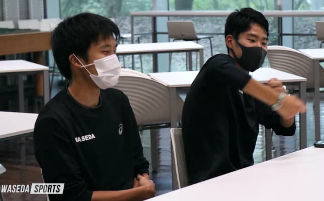 1年目の春から、早くもエンジをまとった石塚陽士(教1=東京・早実)と伊藤大志(スポ1=長野・佐久長聖)。5月のルーキー対談の様子、そして相楽豊駅伝監督(平15人卒=福島・安積)からも「(合宿中)ずっと元気」と評されるこの二人だが、今回もそれを感じられる対談となった。前半は入学後の半年の振り返り、後半では競技面について。そして最後には番外編として、序盤に載せきれなかった内容を掲載する。