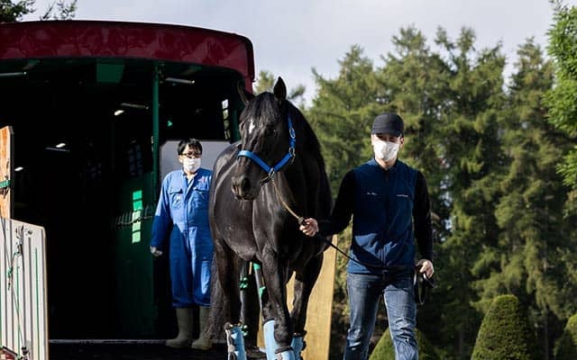 種牡馬入りのタニノフランケルがレックススタッドに到着(撮影:山中博喜)