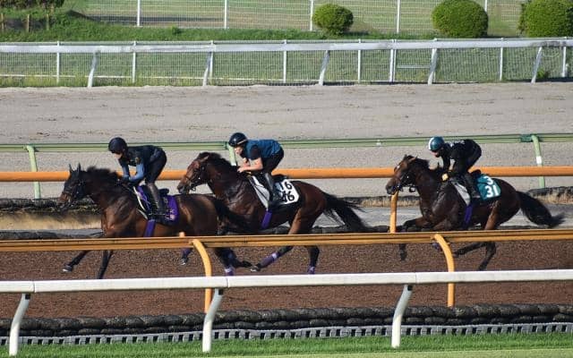 京都大賞典へ向けて2週前追い切りを行っているヒートオンビート(写真中央、撮影:井内利彰)