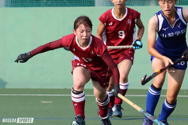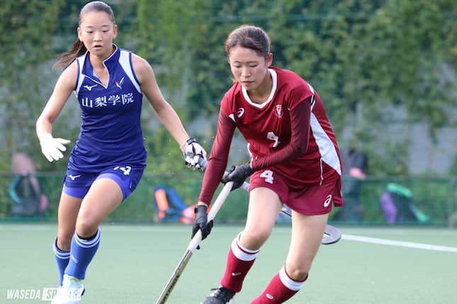 山梨学院大のセンターパスで試合が始まった。第1Q2分に山梨学院大が先制。その後は9回のPC(ペナルティコーナー)を与えるも無失点で切り抜ける。しかし第2Q終盤にPCから2点を許し、攻撃の機会を作れないまま0-3で前半を折り返した。後半は早大のボールポゼッションの時間が増え、MF山下天海(スポ1=京都・須知)を起点に何度か敵陣サークル内に攻め込むが、山梨学院大の堅守を前にゴールを破ることはできず。第4Q残り3分で5点目を許すと立て続けに2得点を決められ、0-7で敗戦。関東の絶対王者を破ることはできなかった。