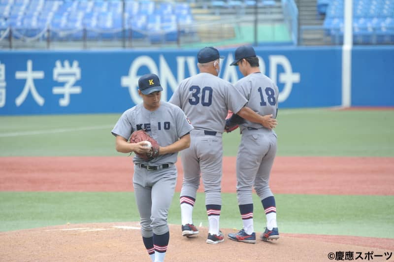 4投手による継投で逃げ切りを図っただが、8回にも2死から安打や四球などで走者満塁とされ、8番・簑尾海斗(文3・日南学園)に勝ち越し適時打を浴びてしまう。その裏、何としても点が欲しい慶大は、死球や相手の失策で満塁のチャンスを作るも、7番・古川智也(環3・広島新庄)、代打・北村謙介(総3・東筑)が浅い外野への飛球に倒れ、簡単に2死となってしまう。しかし、続く代打・綿引達也(商4・慶應)の打席で暴投の間に三塁走者が生還。同点とした。9回にもピンチを迎えるも、渡部淳一(政3・慶應)の好救援で勝ち越しを許さず。その裏、2死で打席には正木。集中力を高めて振り抜いた打球はサヨナラ本塁打を予感させる大飛球となるも、あとひと伸び足りず。第1戦は痛み分けに終わった。
